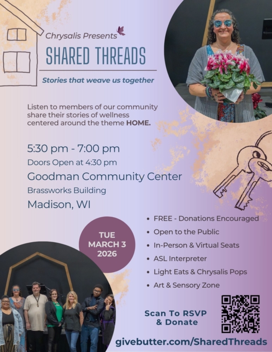 Chrysalis, Inc. will offer community members a platform to share personal stories of resilience and connection at the 4th annual Shared Threads: Stories That Weave Us Together on Tuesday, March 3, 5:30-7 p.m., at the Goodman Community Center’s Brassworks Building. The storytelling event and fundraiser will take place in person and virtually around the theme of “Home,” and promises to be an inspirational evening of connection and collective healing.