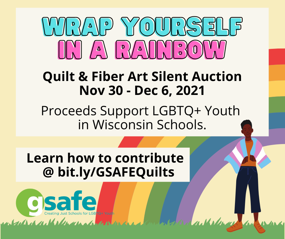 GSAFE is raising money to build strong student leaders while creating Wisconsin K-12 schools that are safe and affirming for LGBTQ+ youth with its 2nd Annual Wrap Yourself in a Rainbow Quilt and Fiber Art Auction. The idea behind the quilt auction began in 2020 at the height of the COVID19 pandemic when the GSAFE staff was brainstorming fundraising ideas. Little did they know, they would begin a tradition that would bring people together and educate the community about the LGBTQ+ community.