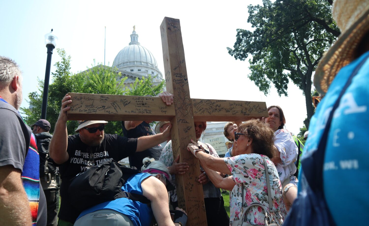 “We’re standing in resistance of what we’re seeing in our nation, in our world, trying to carry a different picture into the future that includes all people that is a non-violent world, instead of a violent world,” said Femi Akinmoladun, a representative of Wisconsin Poor People’s Campaign and one of the few who held the cross at the rally.