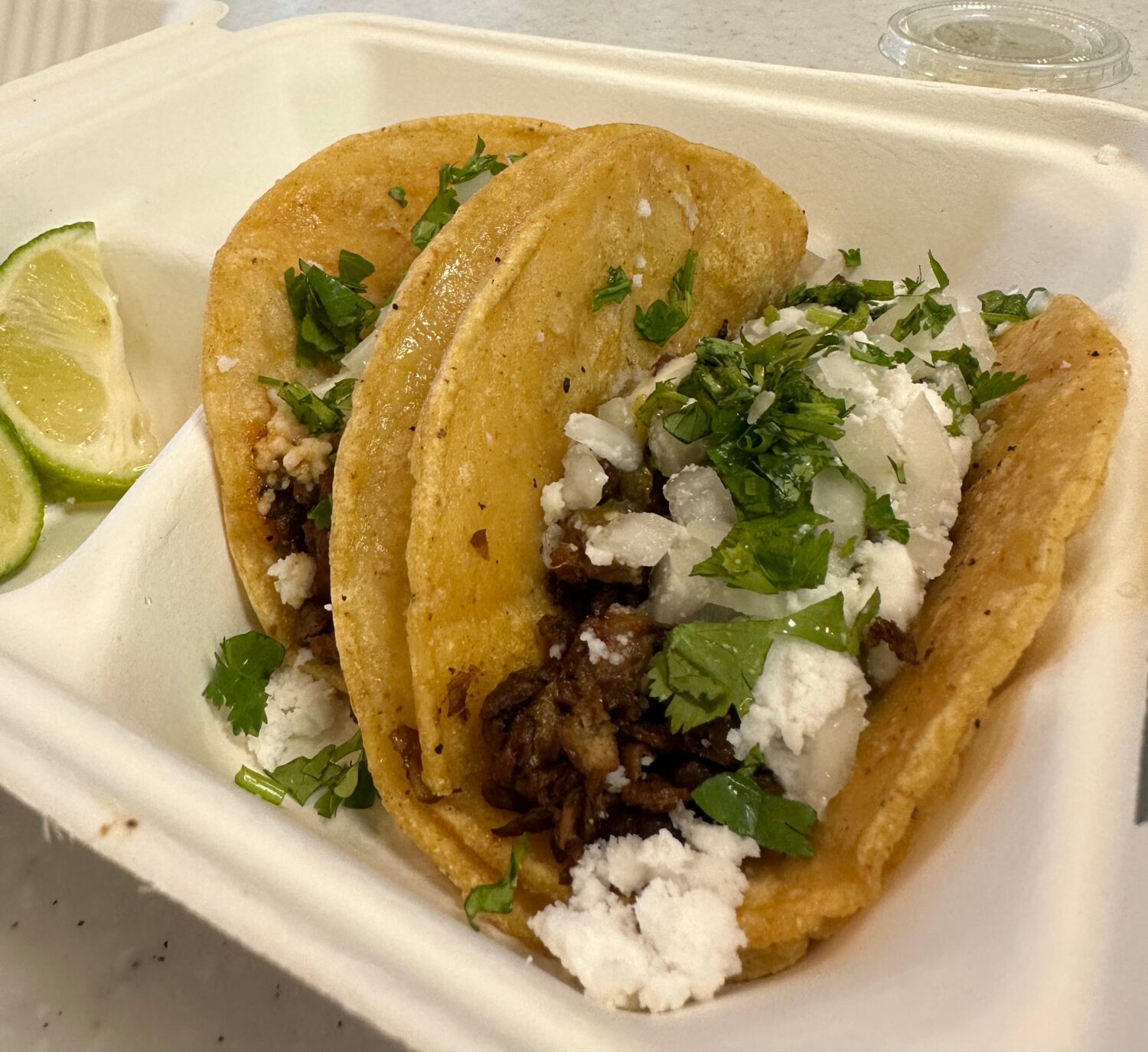The menu features three main tacos: jerk jackfruit, smoked mushroom, and a vegan steak made from seitan — all marinated overnight for maximum flavor. The mushroom taco, paired with their Calypso rice and stir-fried cabbage, is a personal favorite for Wade.