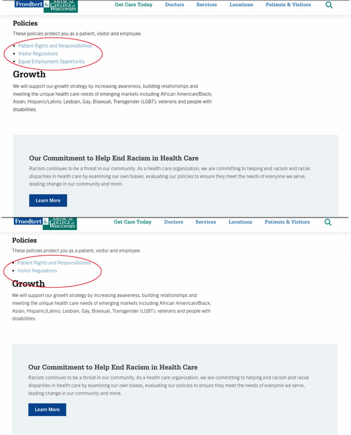 Froedtert did the opposite, by maintaining its webpages on diversity, equity and inclusion, but removing its equal opportunity policy document from the pages.