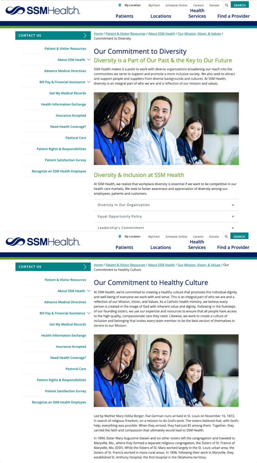 SSM Health also notably replaced the section discussing diversity with comment on SSM Health’s mission as a Catholic ministry. On the updated page, the system discusses its commitment to follow in the footsteps of its founders to ensure “all people have access to the high-quality, compassionate care they need.”